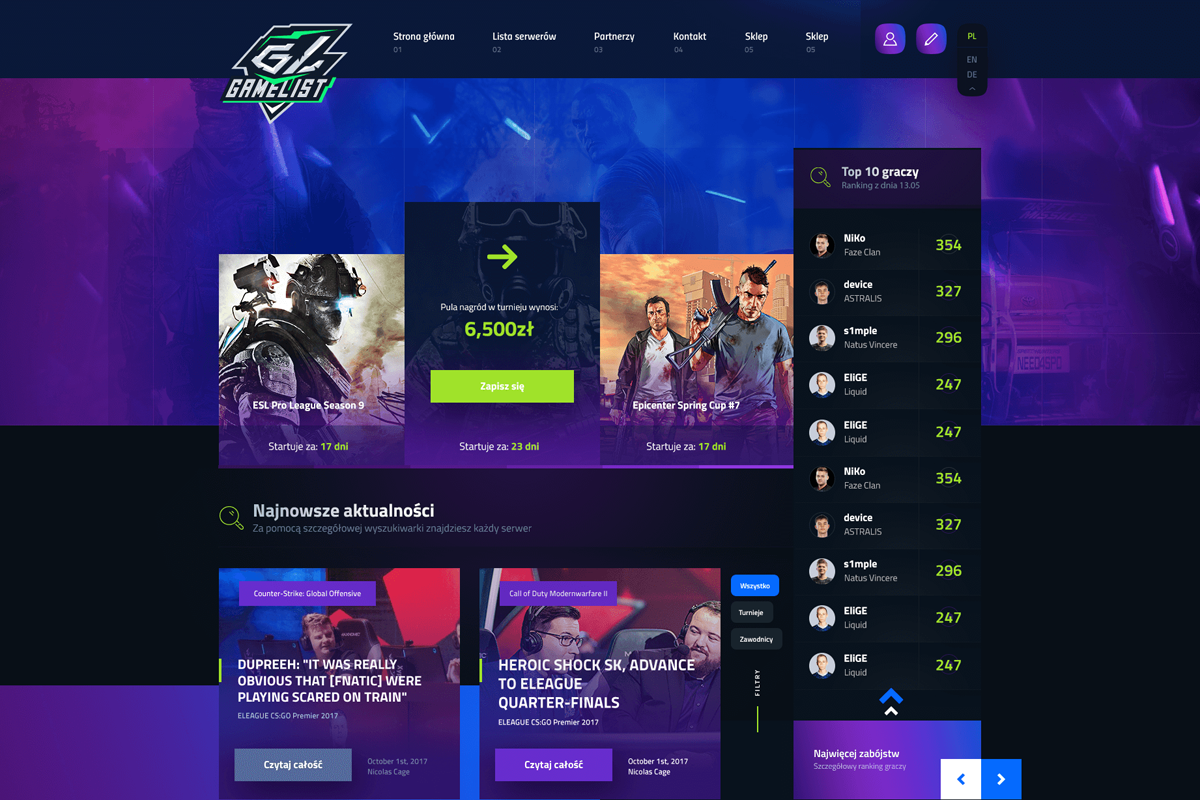 Z czasem Gamelist zaczął żyć własnym życiem i ewoluował w centrum dla graczy – dodaliśmy profile graczy, sklep z pamiątkami, integrację z dropshippingiem na kosy z CS:GO, a także rozbudowany moduł do organizacji turniejów w CS:GO z pełną automatyzacją, oraz system publicznych meczy, wzorowany na rozwiązaniach typu Faceit.